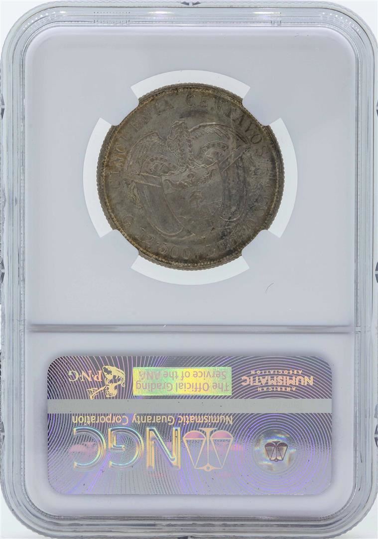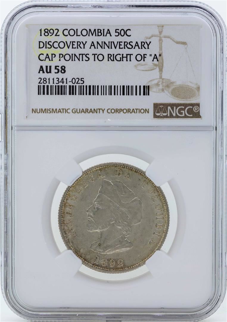 One 1892 Colombia 50 Centavos Discovery Anniversary Silver Coin AU58. NGC Certified.