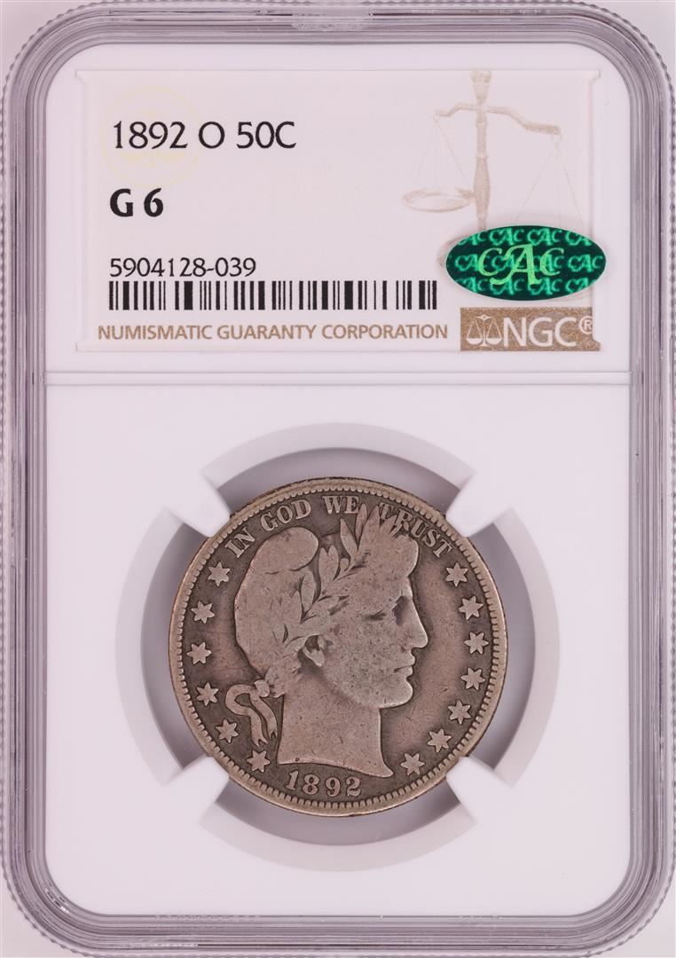 One 1892-O Barber Half Dollar Coin NGC G6 CAC. NGC Certified.