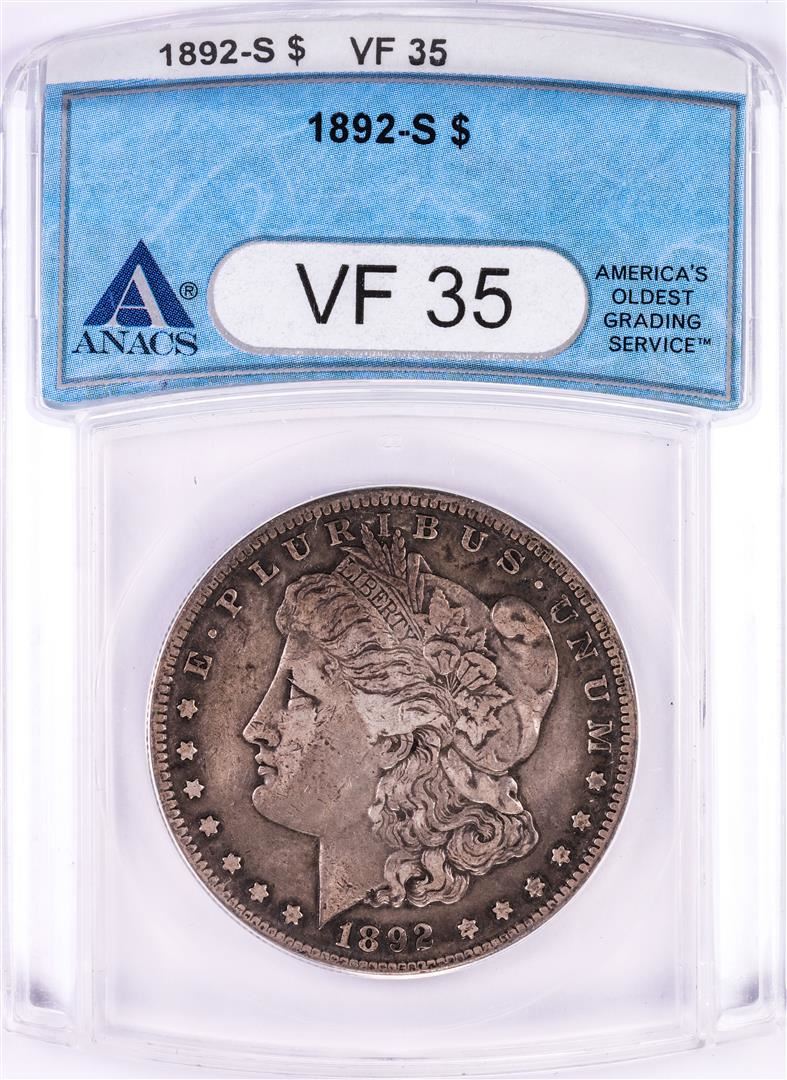 One 1892-S $1 Morgan Silver Dollar Coin ANACS VF35. ANACS Certified.