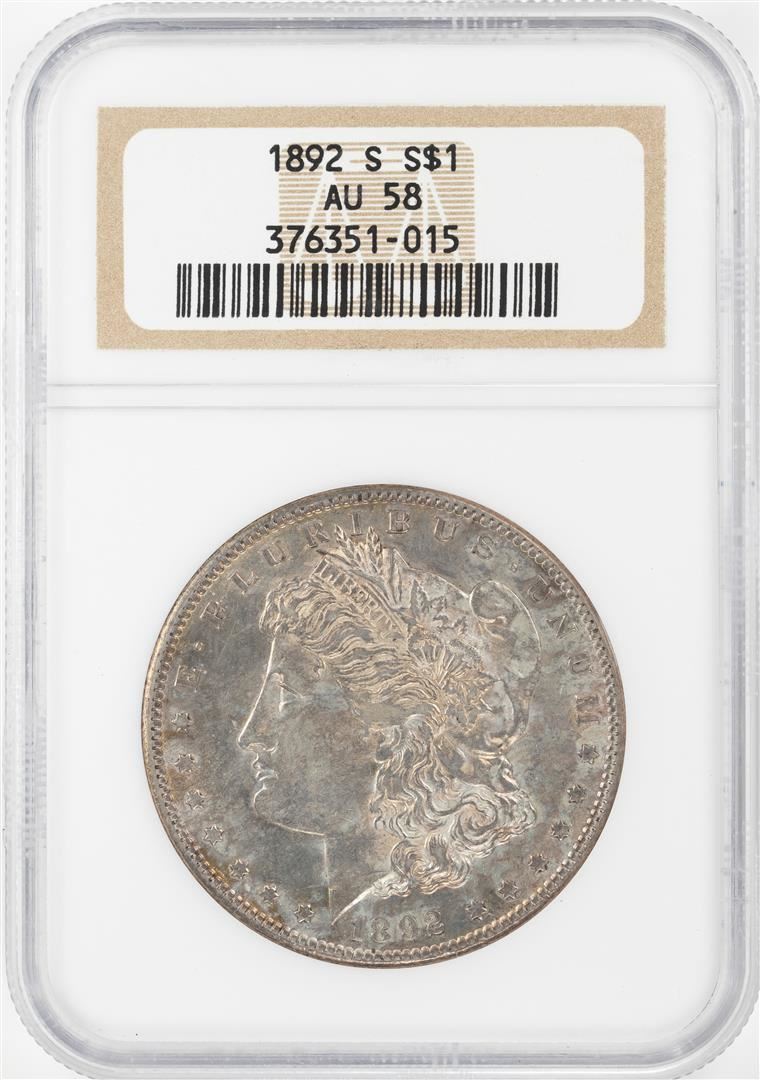 One 1892-S $1 Morgan Silver Dollar Coin NGC AU58. NGC Certified.