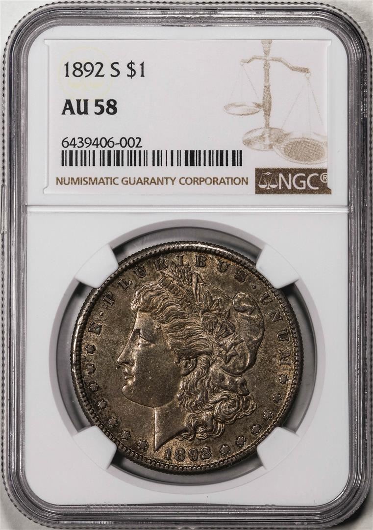 One 1892-S $1 Morgan Silver Dollar Coin NGC AU58. NGC Certified.