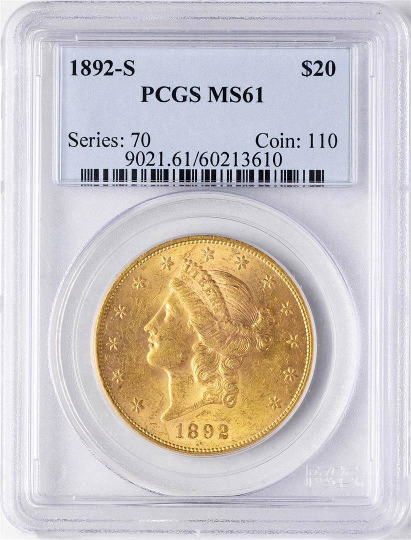 One 1892-S $20 Liberty Head Double Eagle Gold Coin PCGS MS61. PCGS Graded.