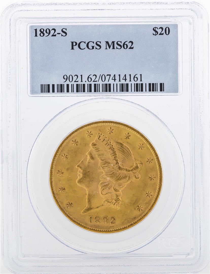 One 1892-S $20 Liberty Head Double Eagle Gold Coin PCGS MS62. PCGS Graded.
