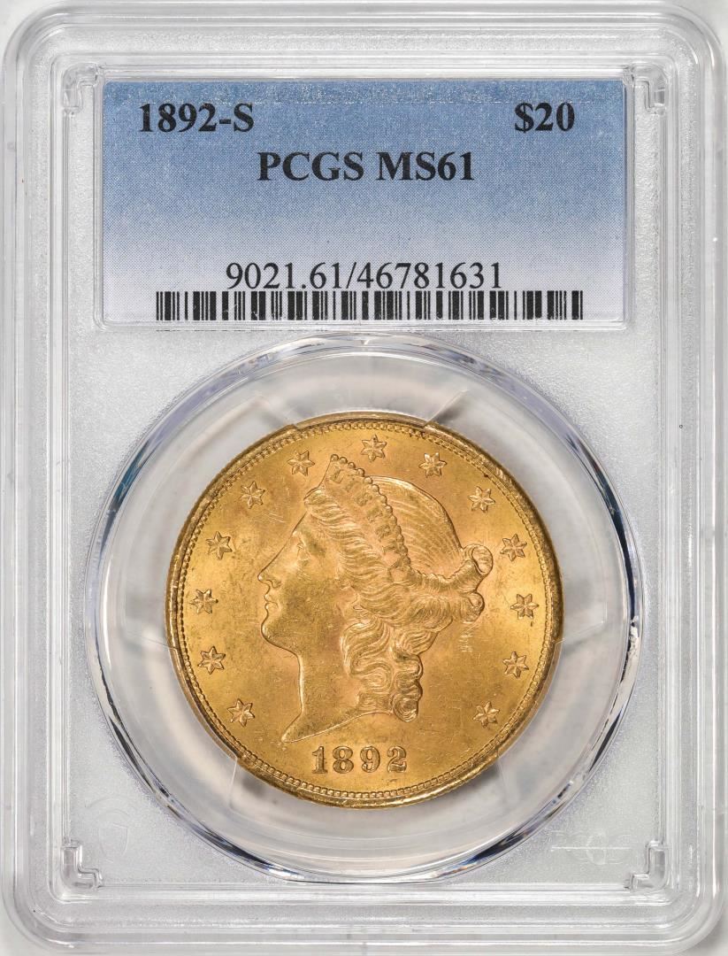 One 1892-S $20 Liberty Head Eagle Gold Coin PCGS MS61. PCGS Graded.
