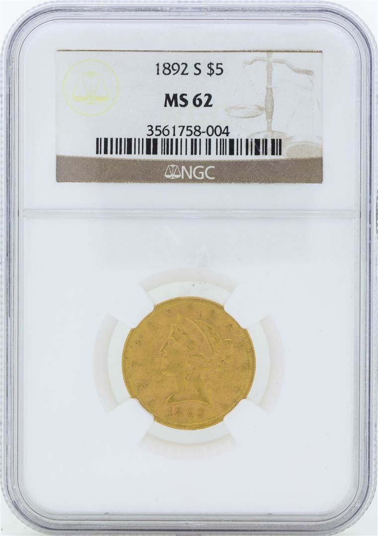 One 1892-S $5 Liberty Head Half Eagle Gold Coin NGC MS62. NGC Certified.