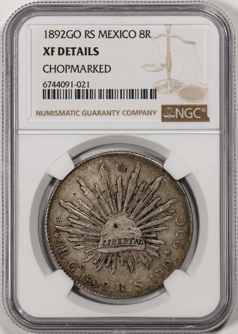 One 1892GO RS Mexico 8 Reales Silver Coin NGC XF Details Chopmarked. NGC Certified.