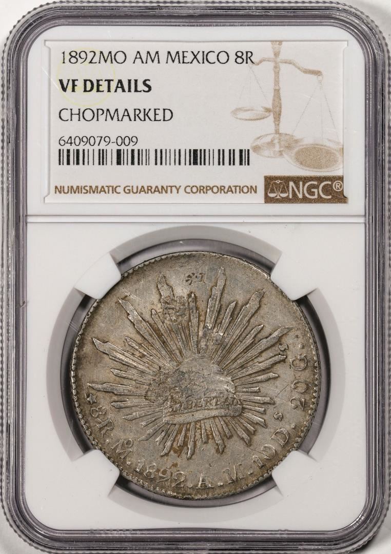 One 1892MO AM Mexico 8 Reales Silver Coin NGC VF Details Chopmarked. NGC Certified.