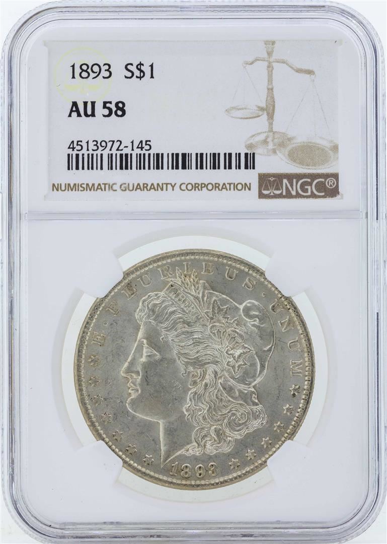 One 1893 $1 Morgan Silver Dollar Coin NGC AU58. NGC Certified.