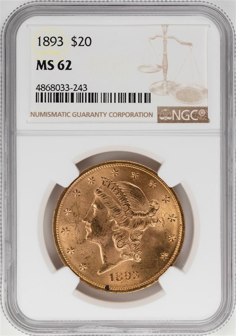 One 1893 $20 Liberty Head Double Eagle Gold Coin NGC MS62. NGC Certified.