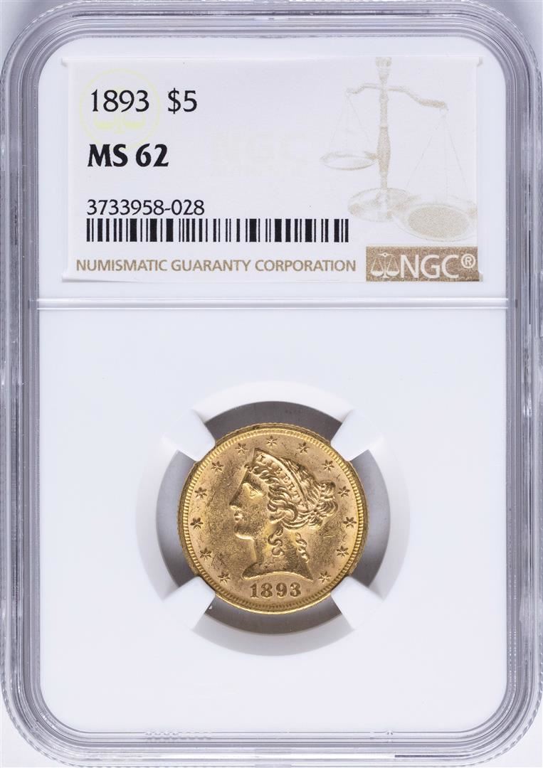One 1893 $5 Liberty Head Half Eagle Gold Coin NGC MS62. NGC Certified.