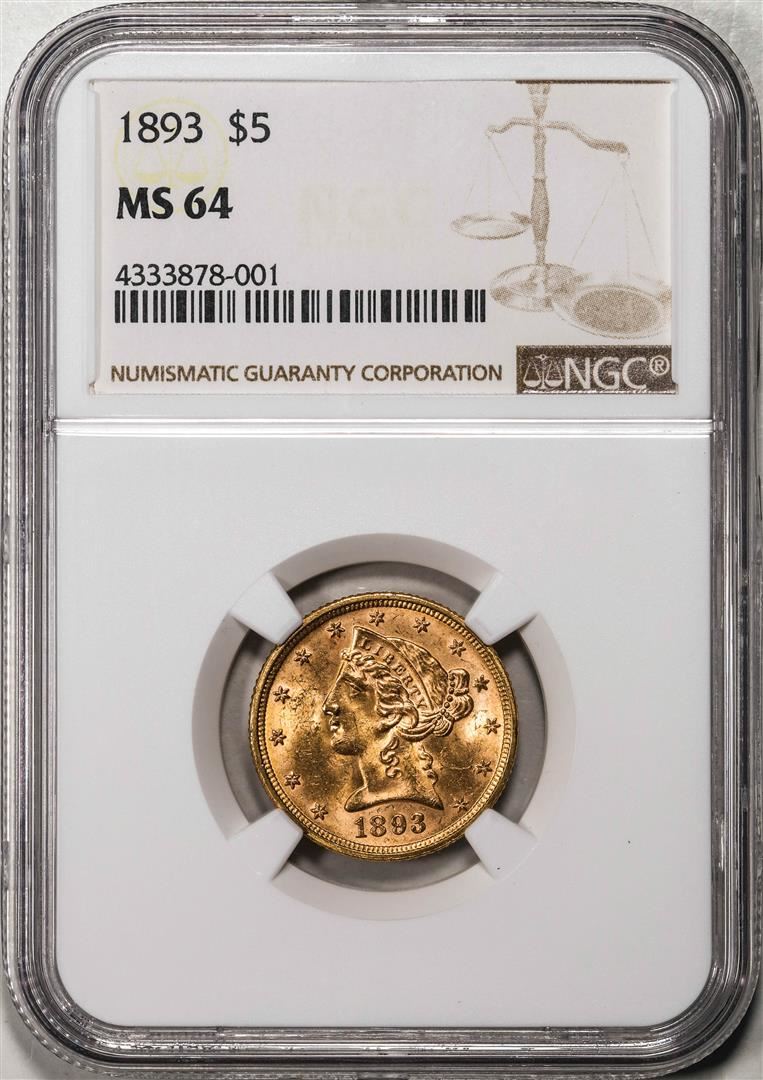 One 1893 $5 Liberty Head Half Eagle Gold Coin NGC MS64. NGC Certified.