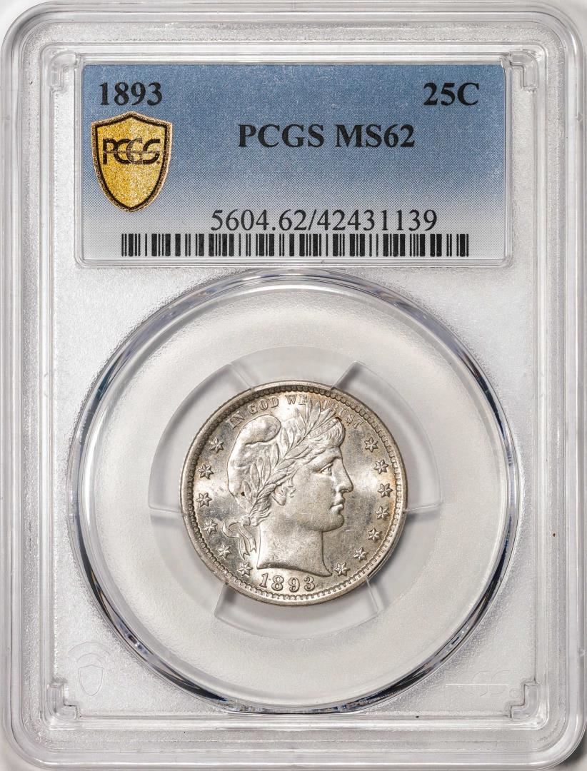 One 1893 Barber Quarter Coin PCGS MS62. PCGS Graded.