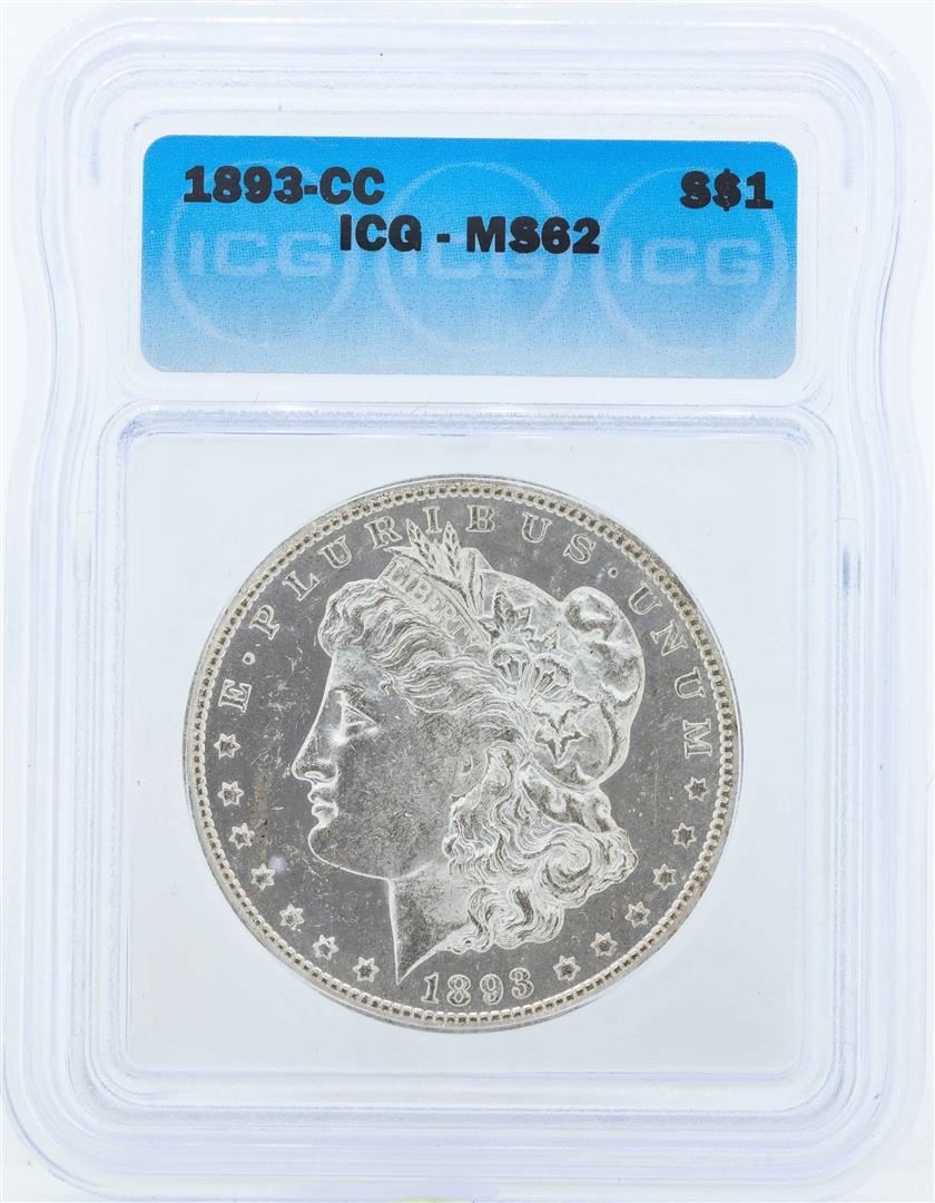 One 1893-CC $1 Morgan Silver Coin ICG MS62. ICG Certified.