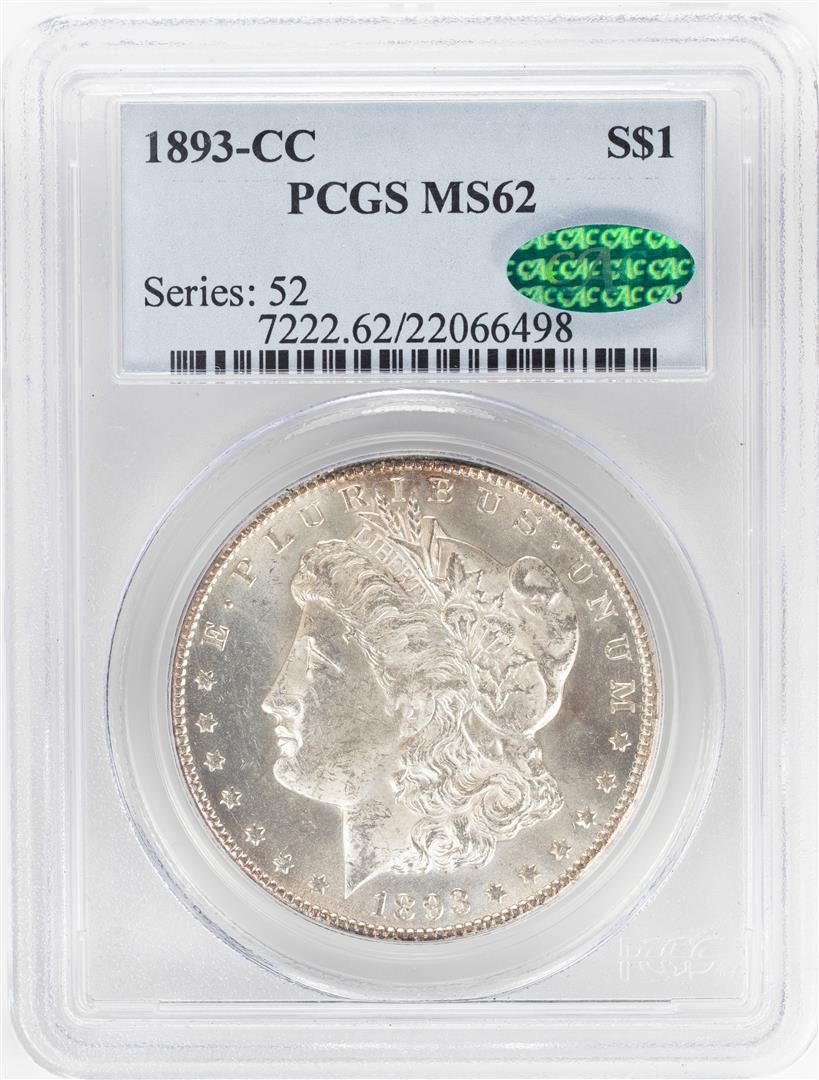 One 1893-CC $1 Morgan Silver Dollar Coin PCGS MS62 CAC. PCGS Graded.