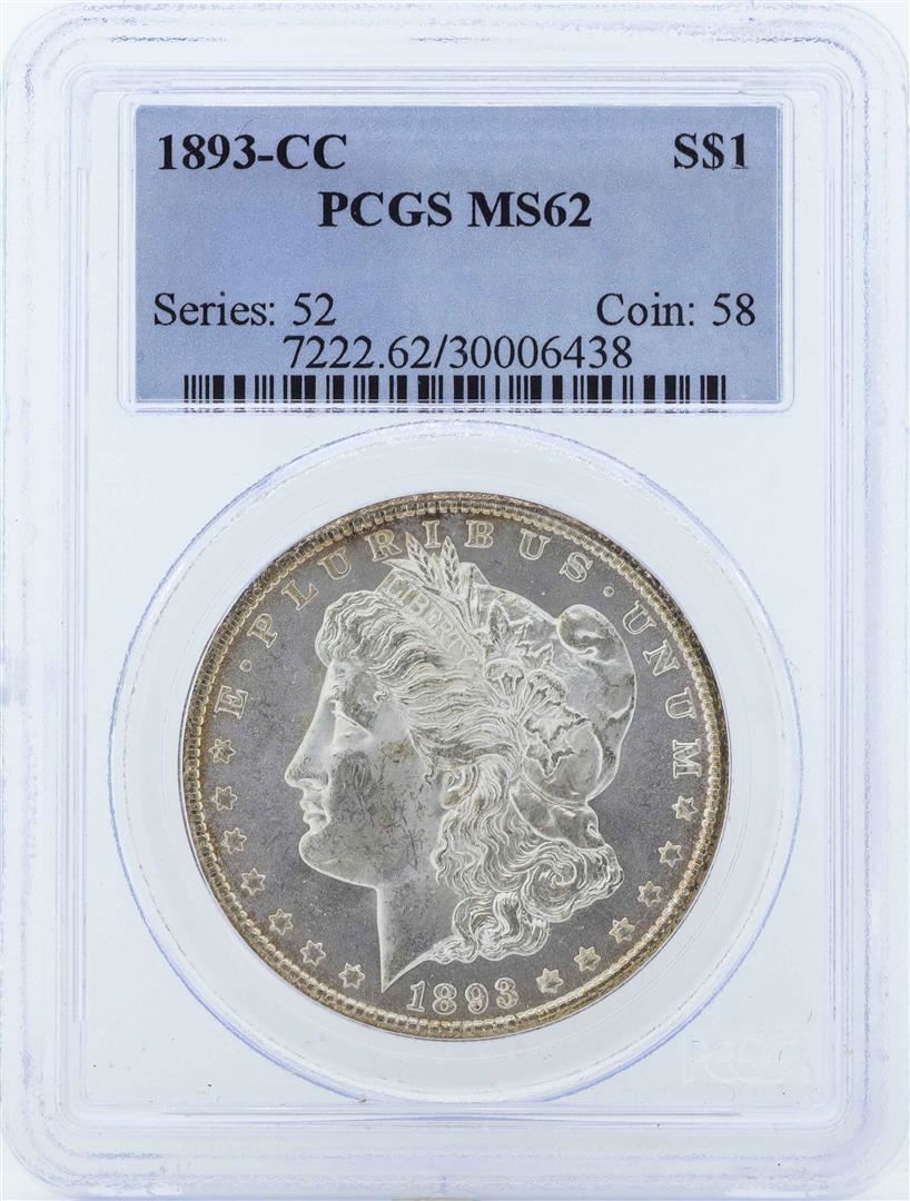 One 1893-CC $1 Morgan Silver Dollar Coin PCGS MS62. PCGS Graded.