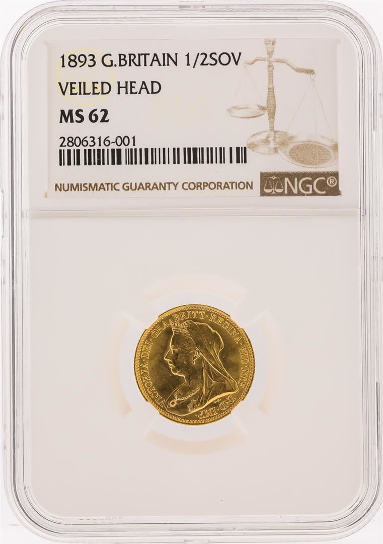 One 1893 Great Britain Half Sovereign Veiled Head Gold Coin NGC MS62. NGC Certified.