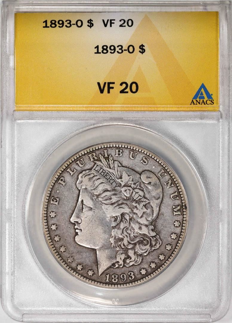 One 1893-O $1 Morgan Silver Dollar Coin ANACS VF20. ANACS Certified.