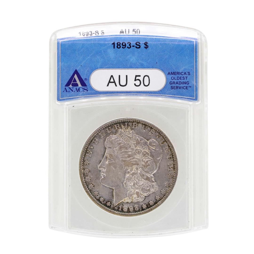 One 1893-S $1 Morgan Silver Dollar Coin ANACS AU50. ANACS Certified.