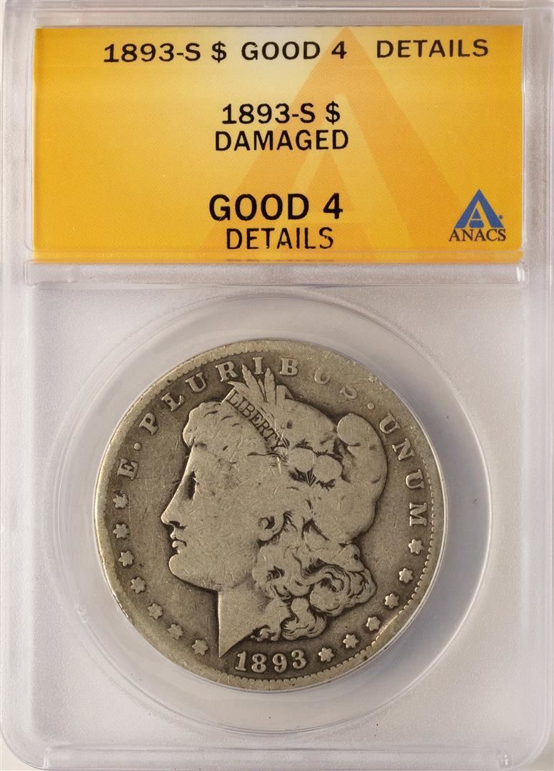One 1893-S $1 Morgan Silver Dollar Coin ANACS Good 4 Details. ANACS Certified.