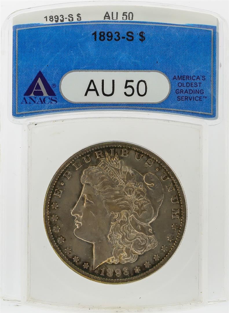 One 1893-S $1 Morgan Silver Dollar Coin ANACS Graded AU50. ANACS Certified.