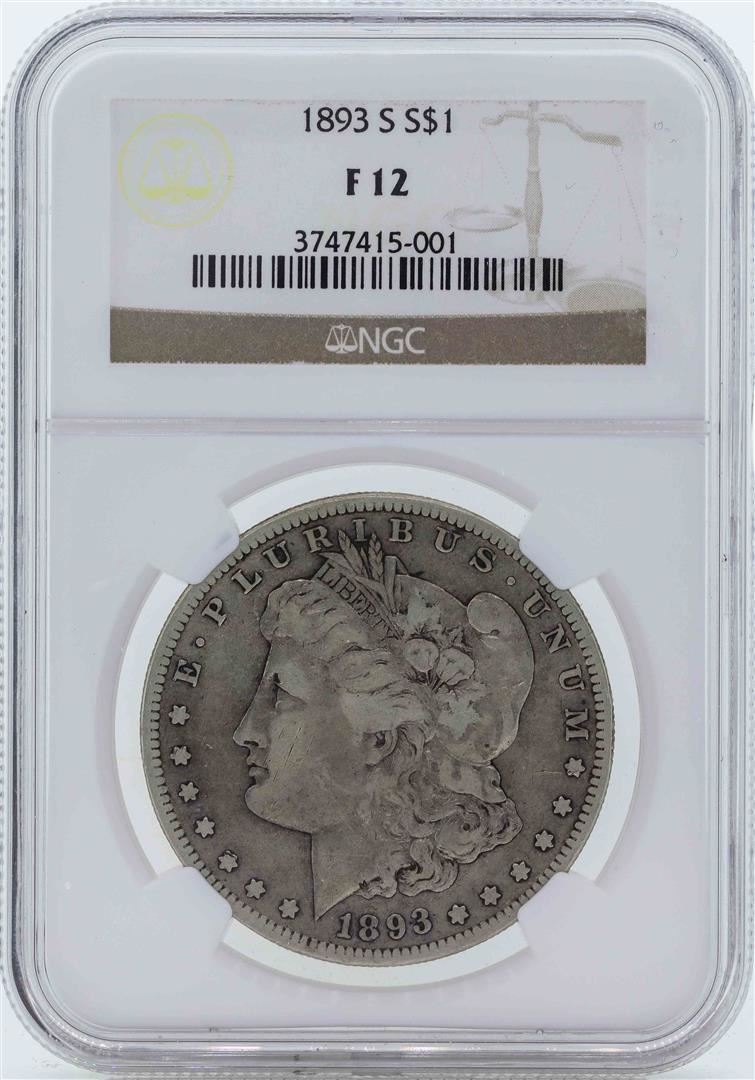 One 1893-S $1 Morgan Silver Dollar Coin NGC F12. NGC Certified.