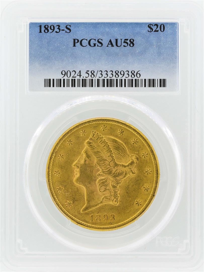 One 1893-S $20 Liberty Head Double Eagle Gold Coin PCGS AU58. PCGS Graded.
