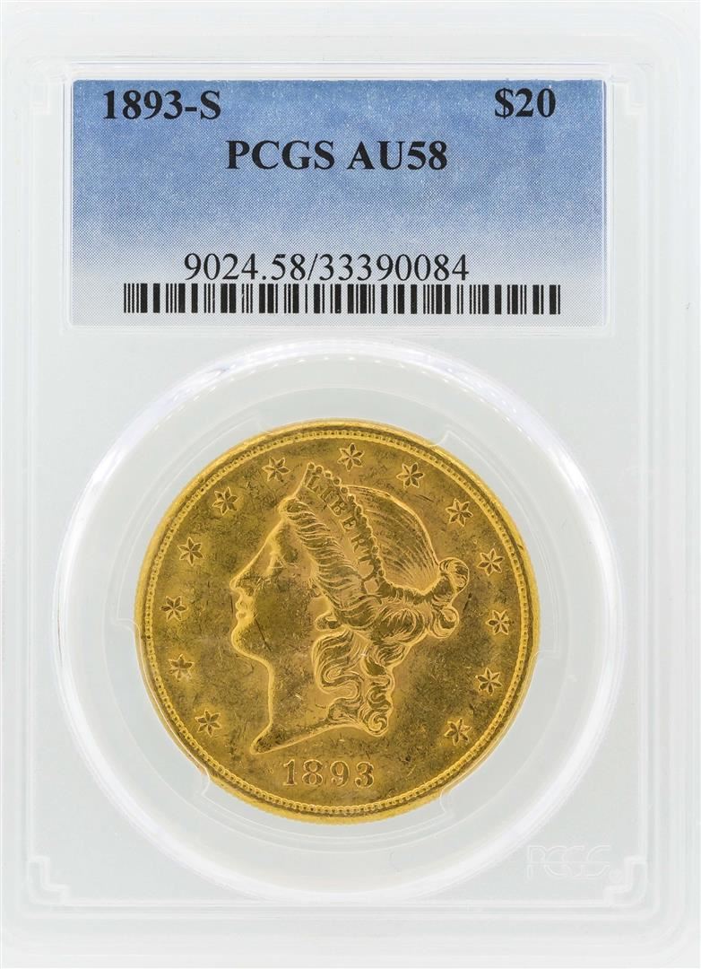 One 1893-S $20 Liberty Head Double Eagle Gold Coin PCGS AU58. PCGS Graded.