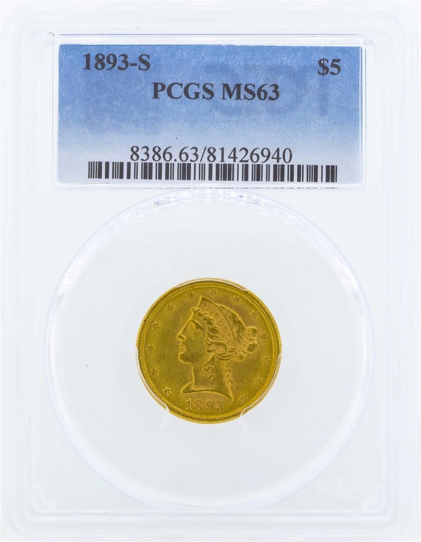 One 1893-S $5 Liberty Head Half Eagle Gold Coin PCGS MS63. PCGS Graded.