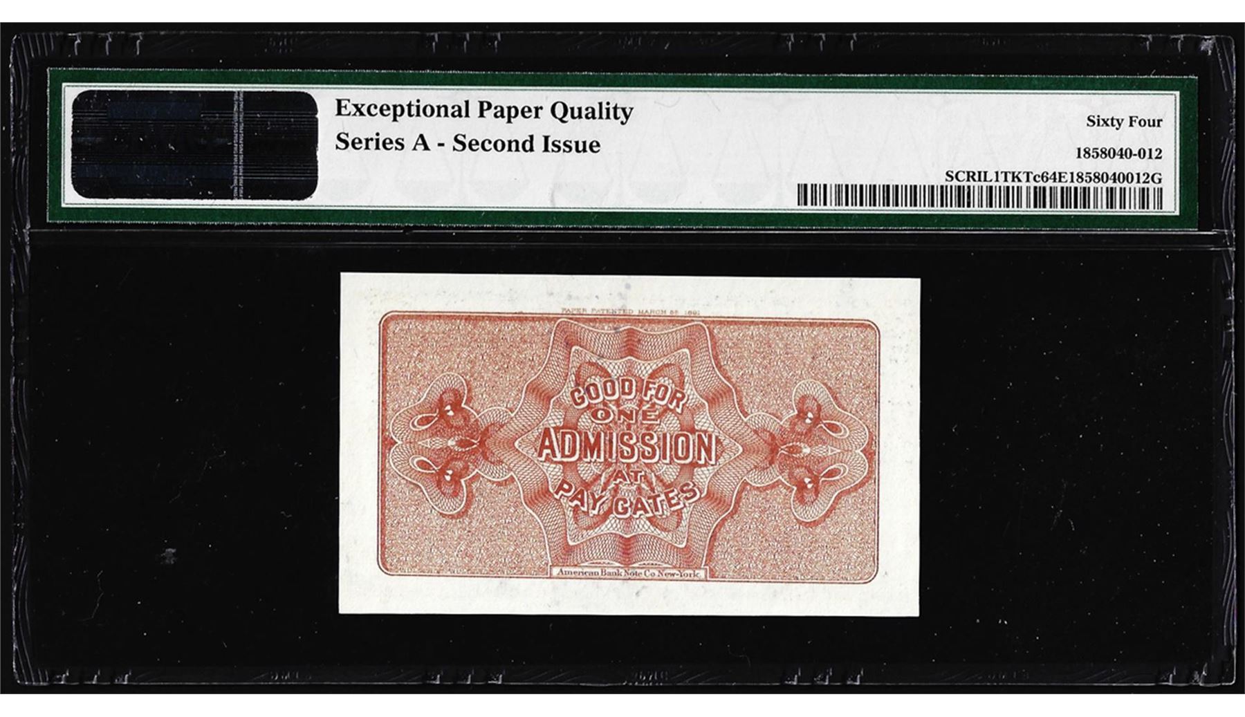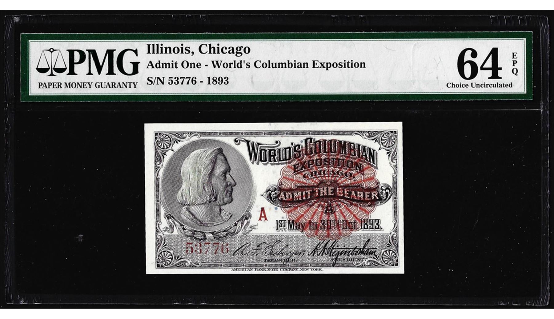 One 1893 World's Columbian Exposition Ticket Columbus PMG Choice Uncirculated 64EPQ. PMG Certified.