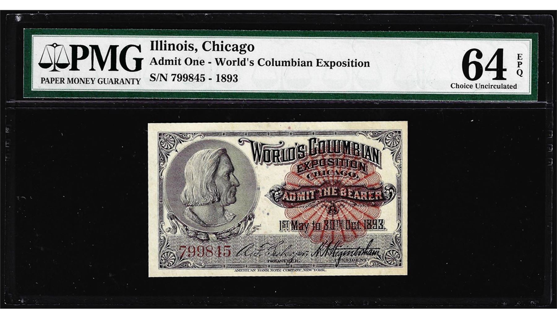 One 1893 World's Columbian Exposition Ticket Columbus PMG Choice Uncirculated 64EPQ. PMG Certified.