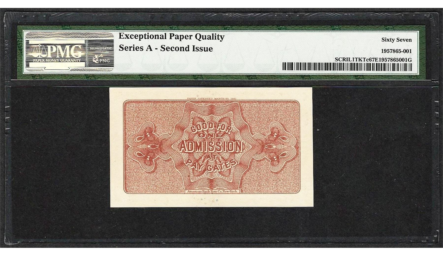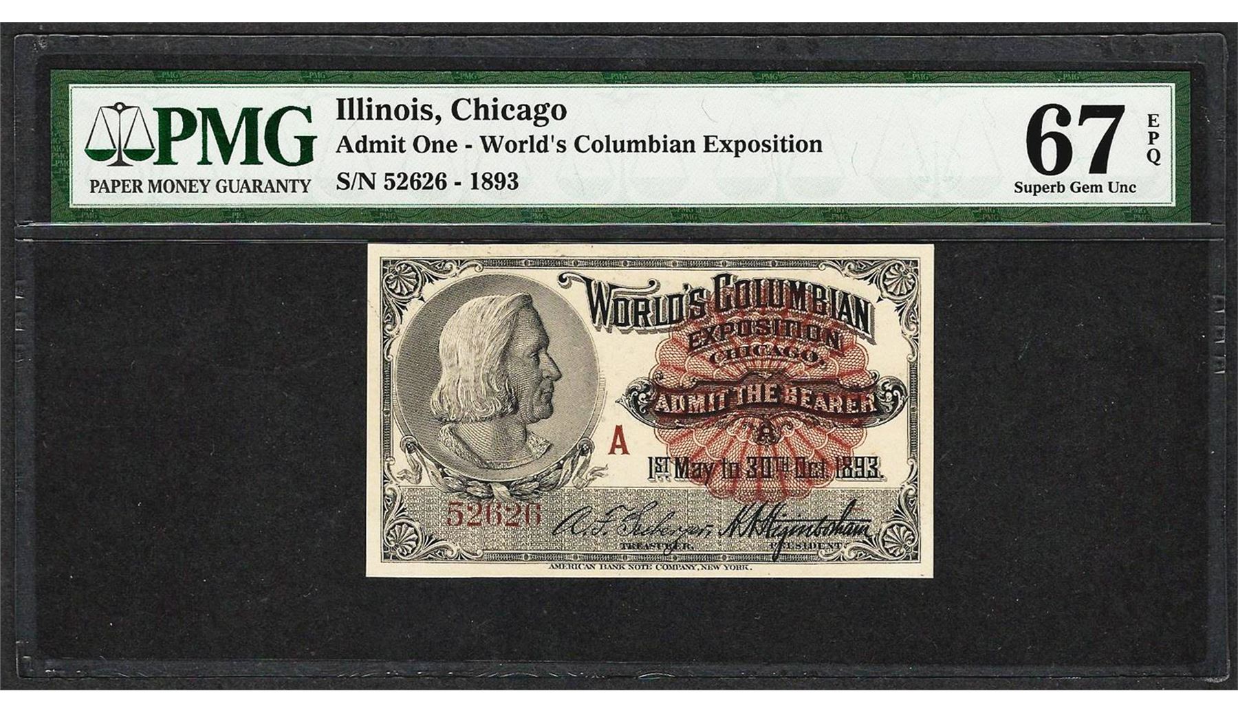 One 1893 World's Columbian Exposition Ticket Columbus PMG Superb Gem Uncirculated 67EPQ. PMG Certified.