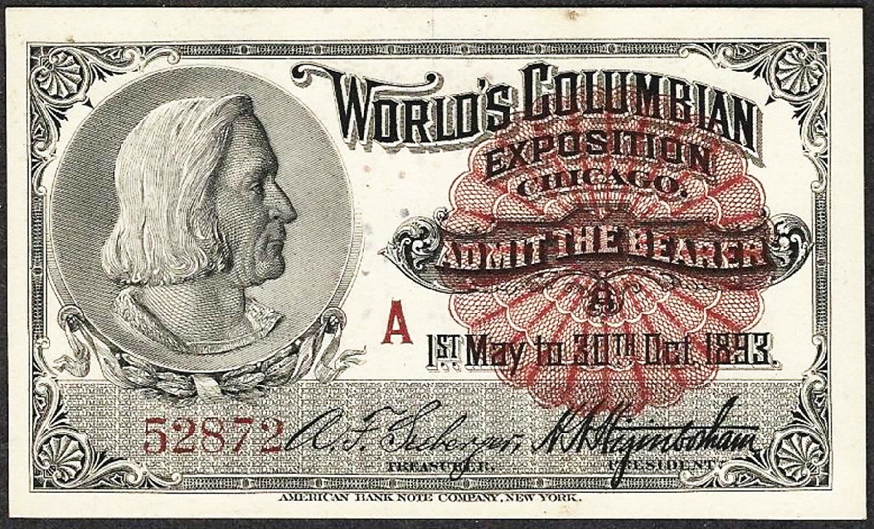 One 1893 World's Columbian Exposition Ticket Columbus.