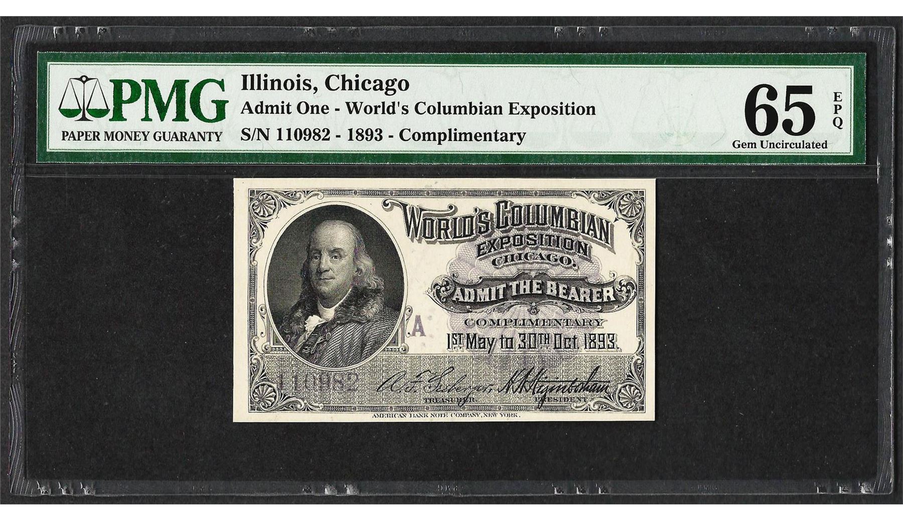 One 1893 World's Columbian Exposition Ticket Franklin PMG Gem Uncirculated 65EPQ. PMG Certified.