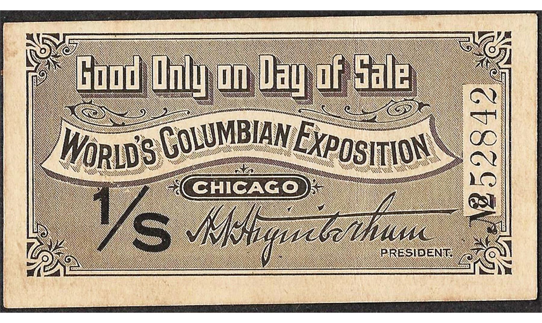 One 1893 World's Columbian Exposition Ticket Good For Only 1 Day 1/S.