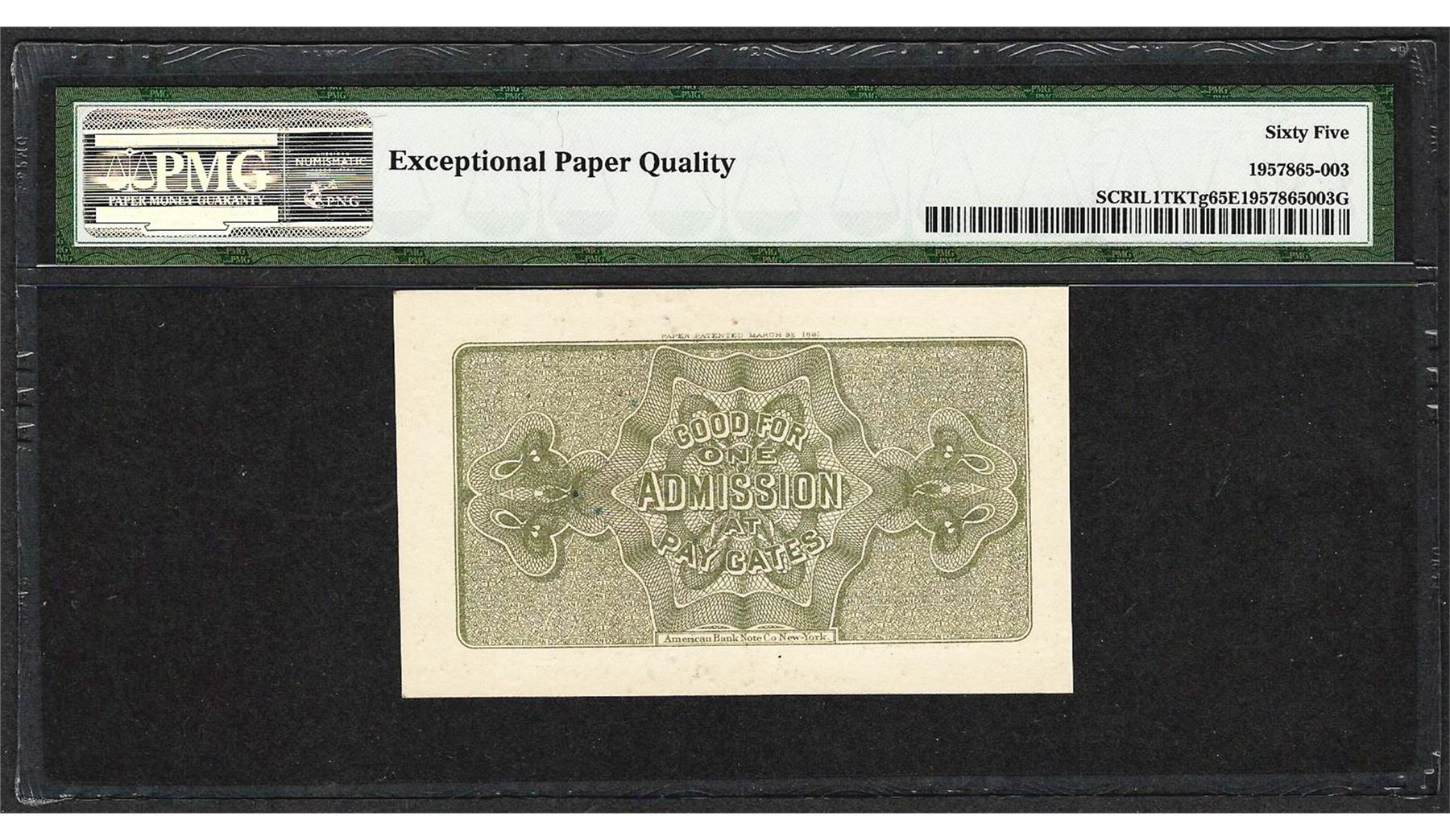 One 1893 World's Columbian Exposition Ticket Handel PMG Gem Uncirculated 65EPQ. PMG Certified.