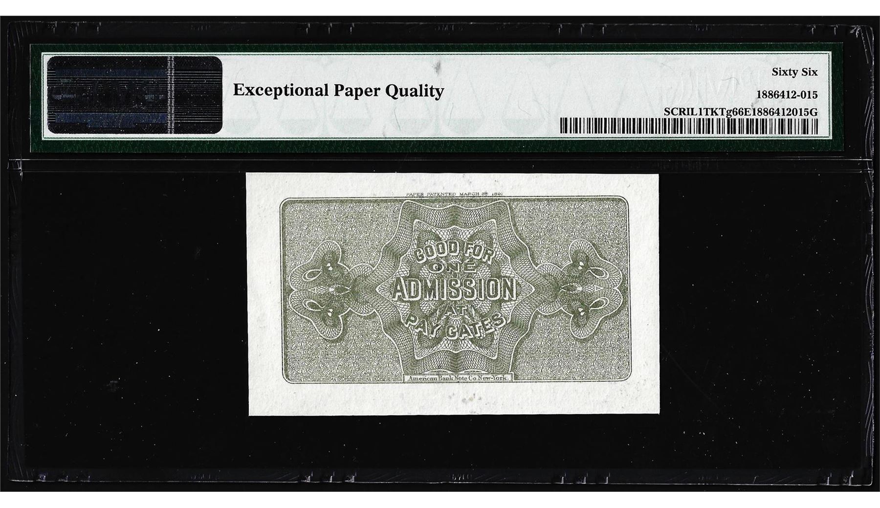 One 1893 World's Columbian Exposition Ticket Handel PMG Gem Uncirculated 66EPQ. PMG Certified.