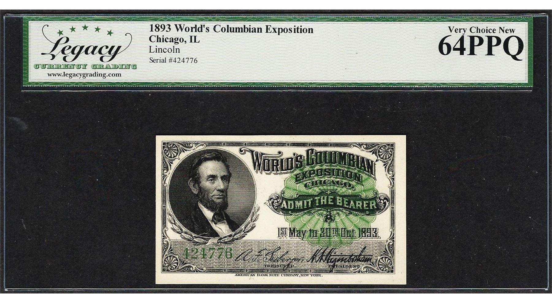 One 1893 World's Columbian Exposition Ticket Lincoln Legacy Very Choice New 64PPQ. Legacy Graded.