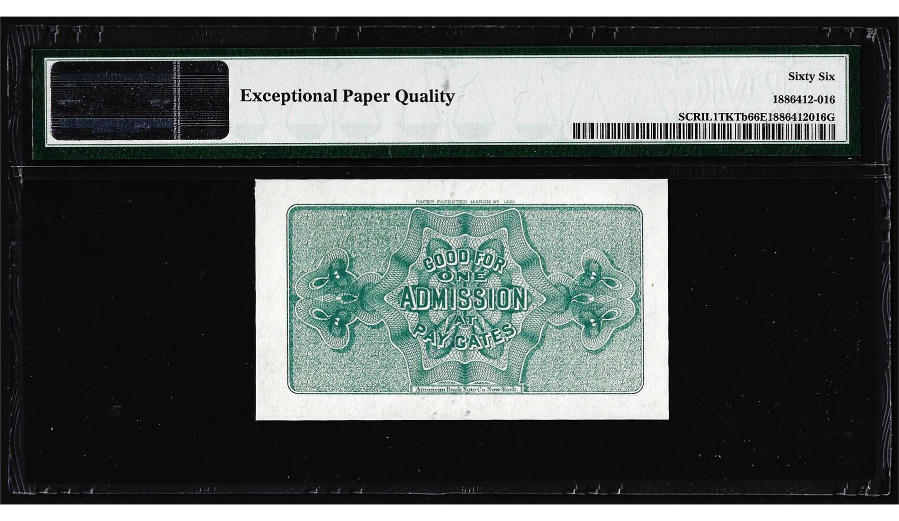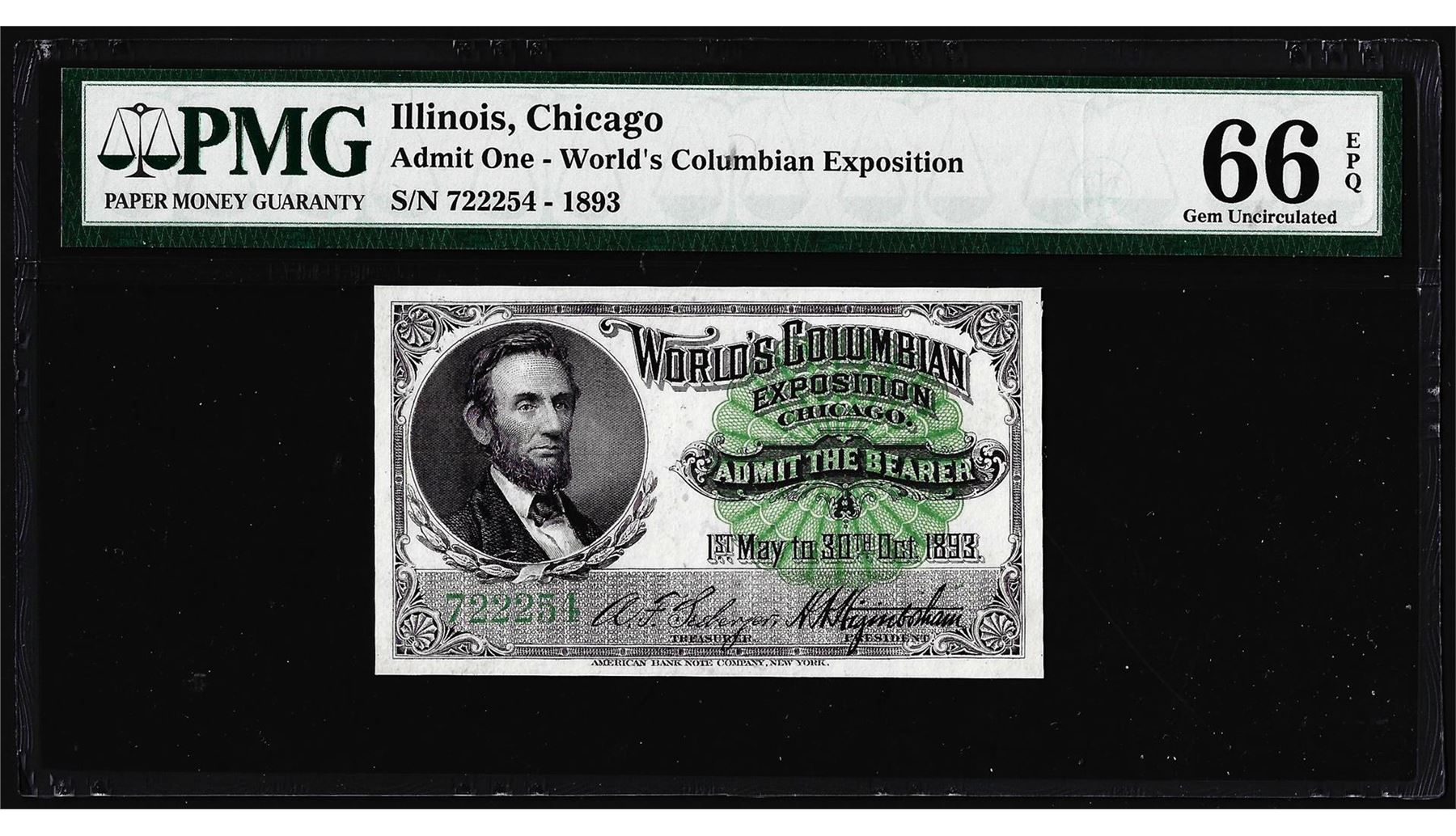 One 1893 World's Columbian Exposition Ticket Lincoln PMG Gem Uncirculated 66EPQ. PMG Certified.