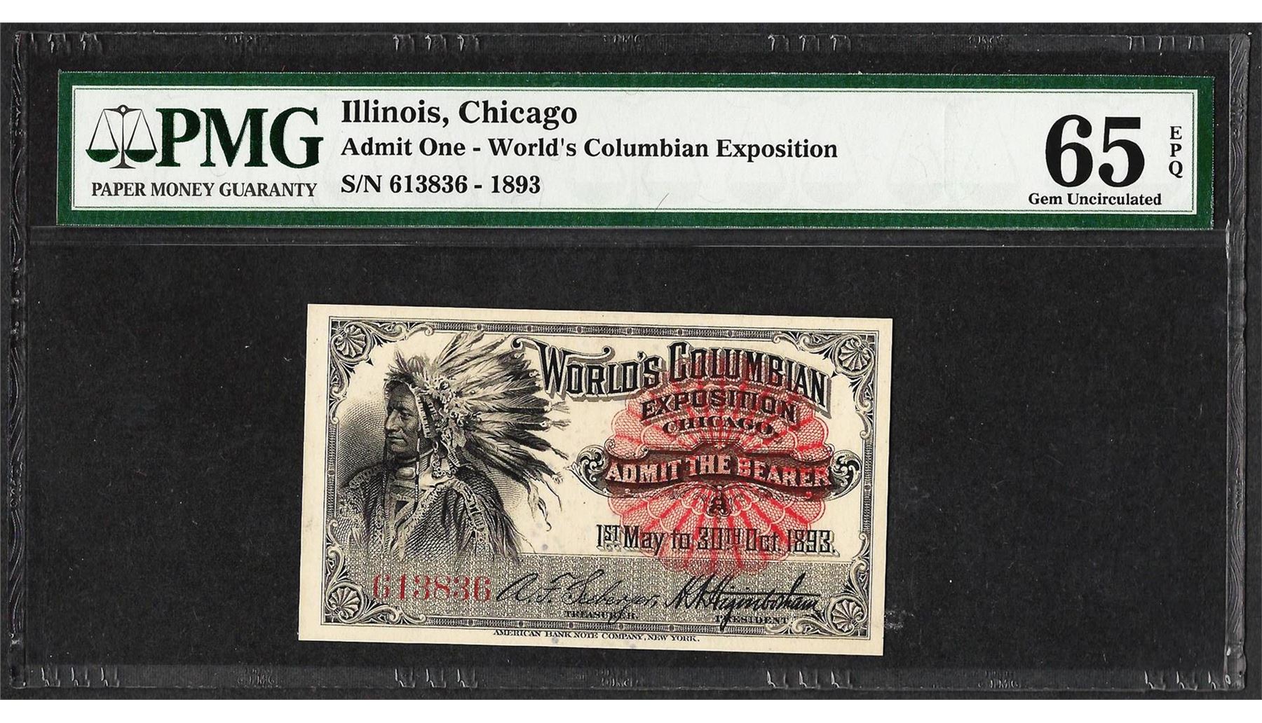 One 1893 World's Columbian Exposition Ticket PMG Gem Uncirculated 65EPQ. PMG Certified.