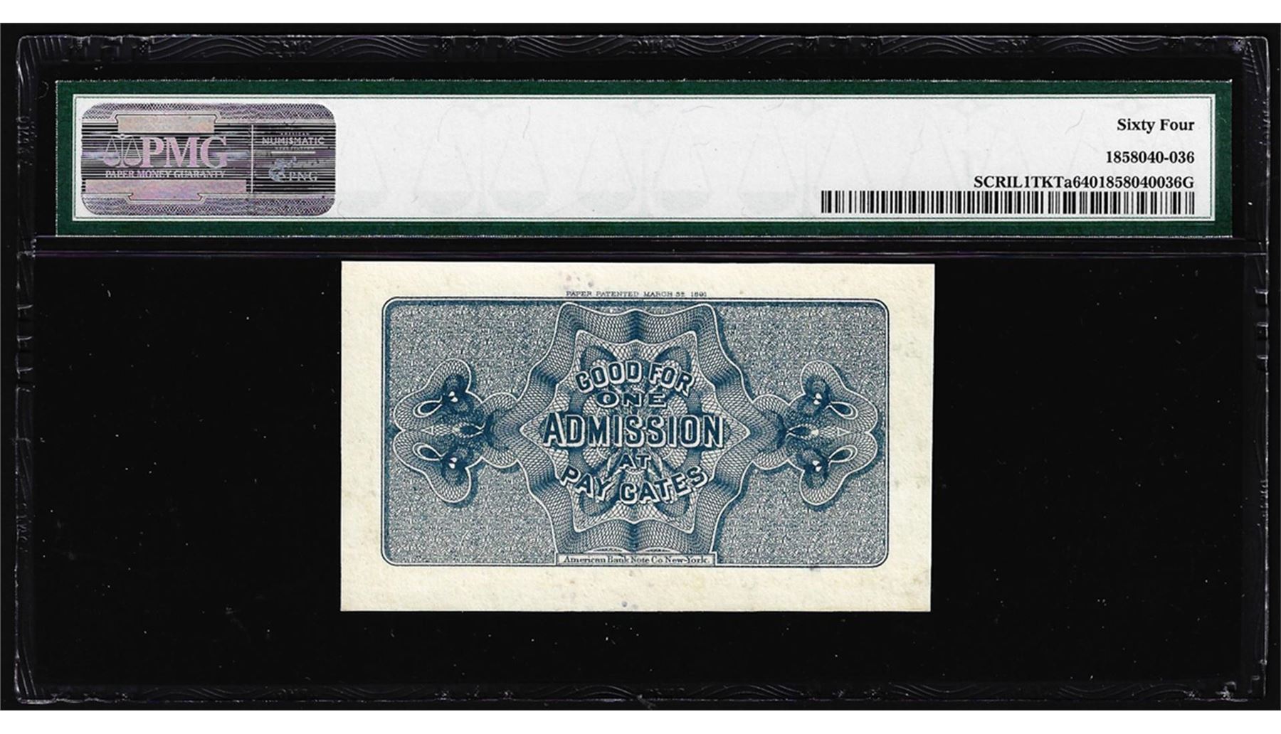 One 1893 World's Columbian Exposition Ticket Washington PMG Choice Uncirculated 64. PMG Certified.