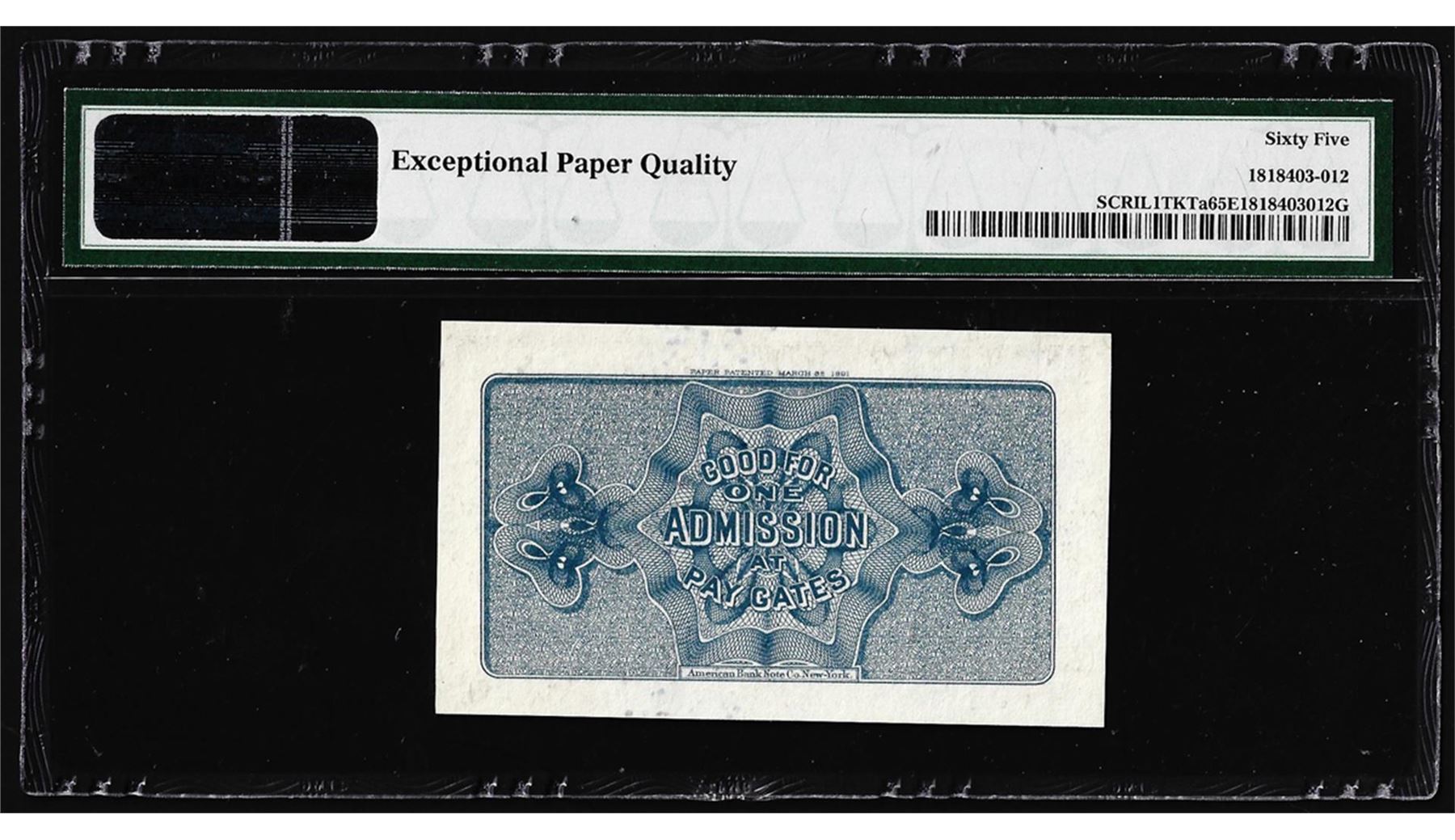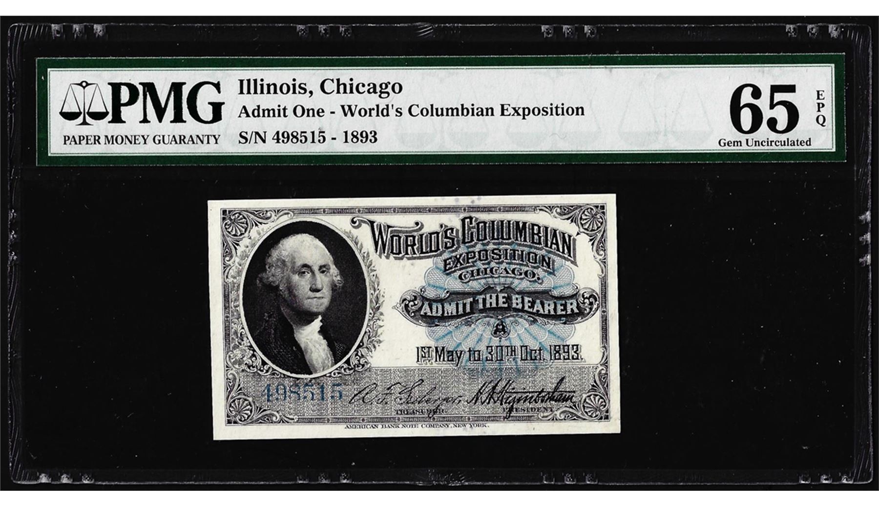 One 1893 World's Columbian Exposition Ticket Washington PMG Gem Uncirculated 65EPQ. PMG Certified.