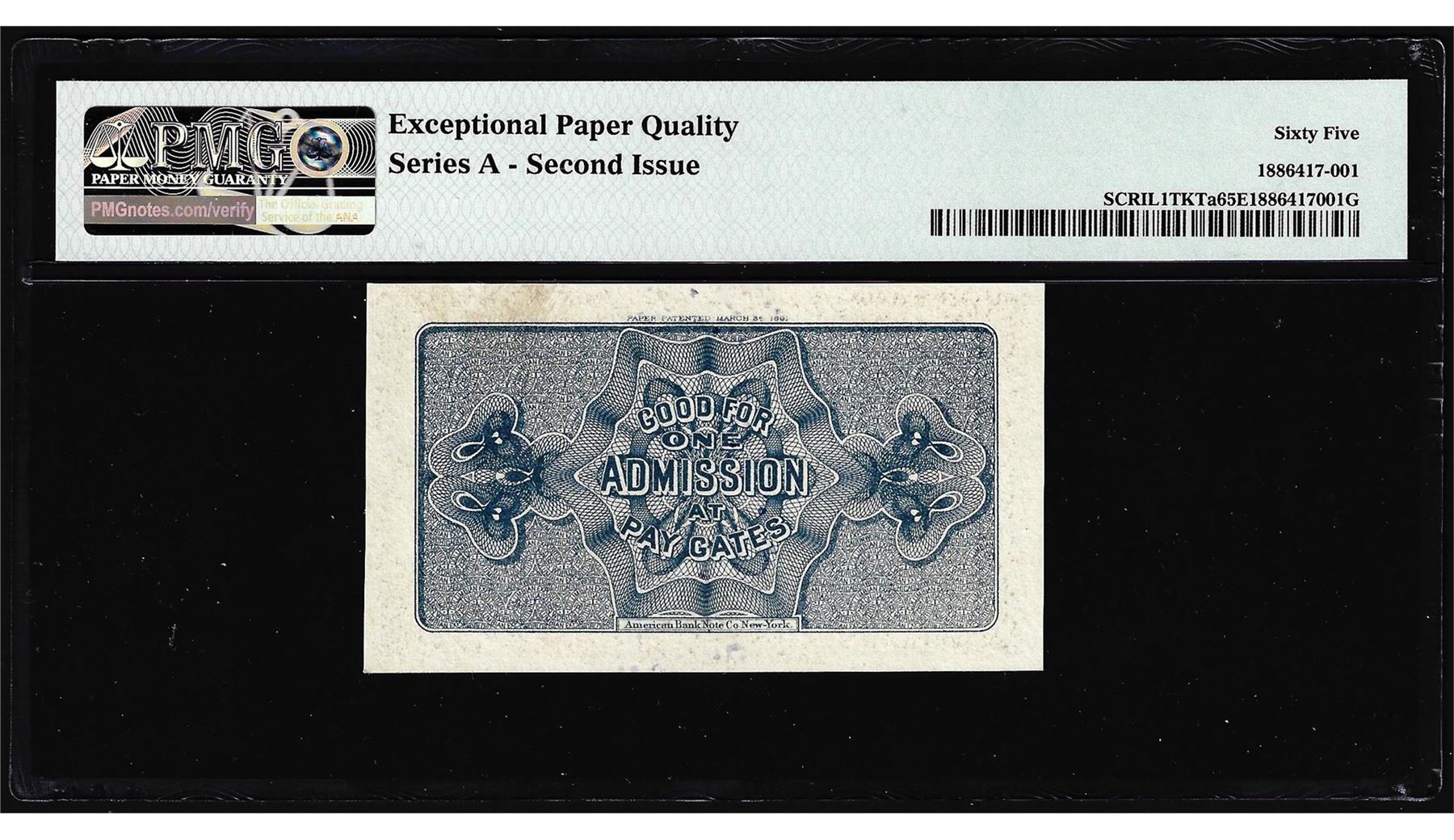 One 1893 World's Columbian Exposition Ticket Washington PMG Gem Uncirculated 65EPQ. PMG Certified.