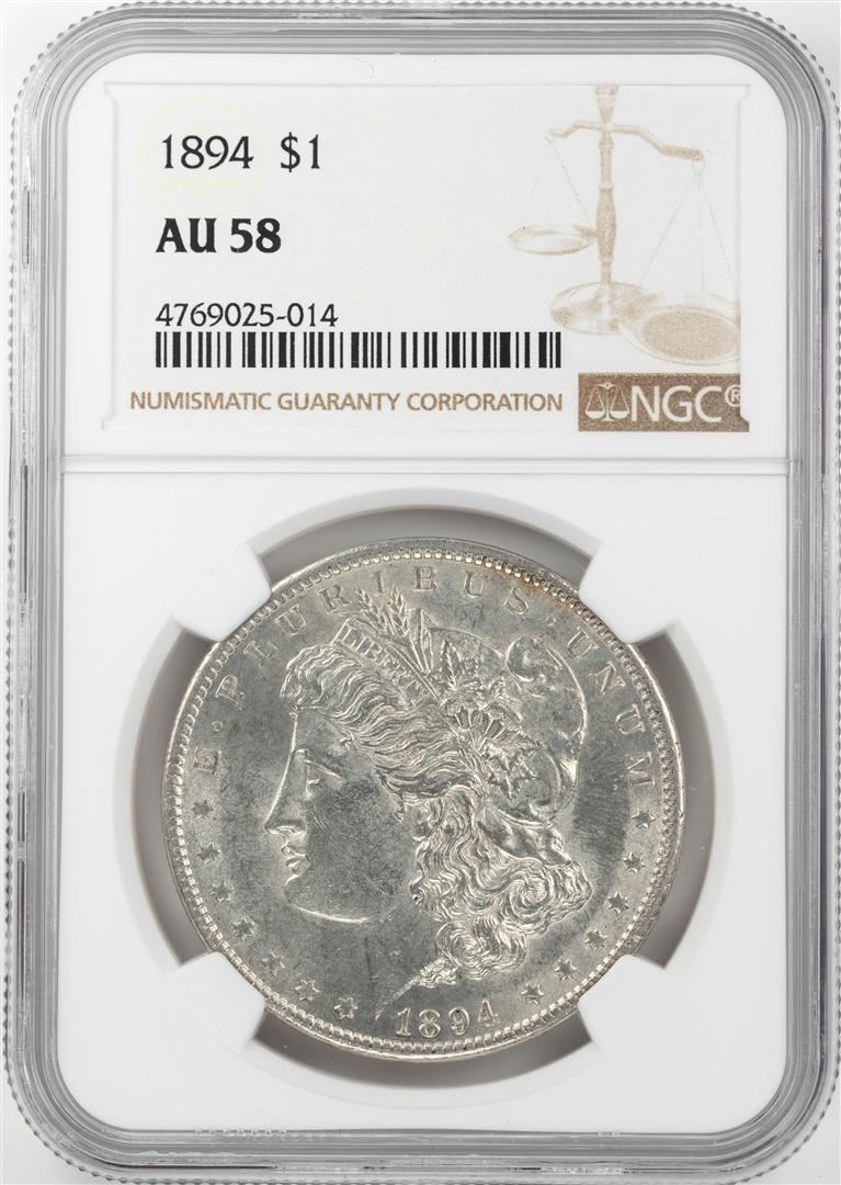 One 1894 $1 Morgan Silver Dollar Coin NGC AU58. NGC Certified.