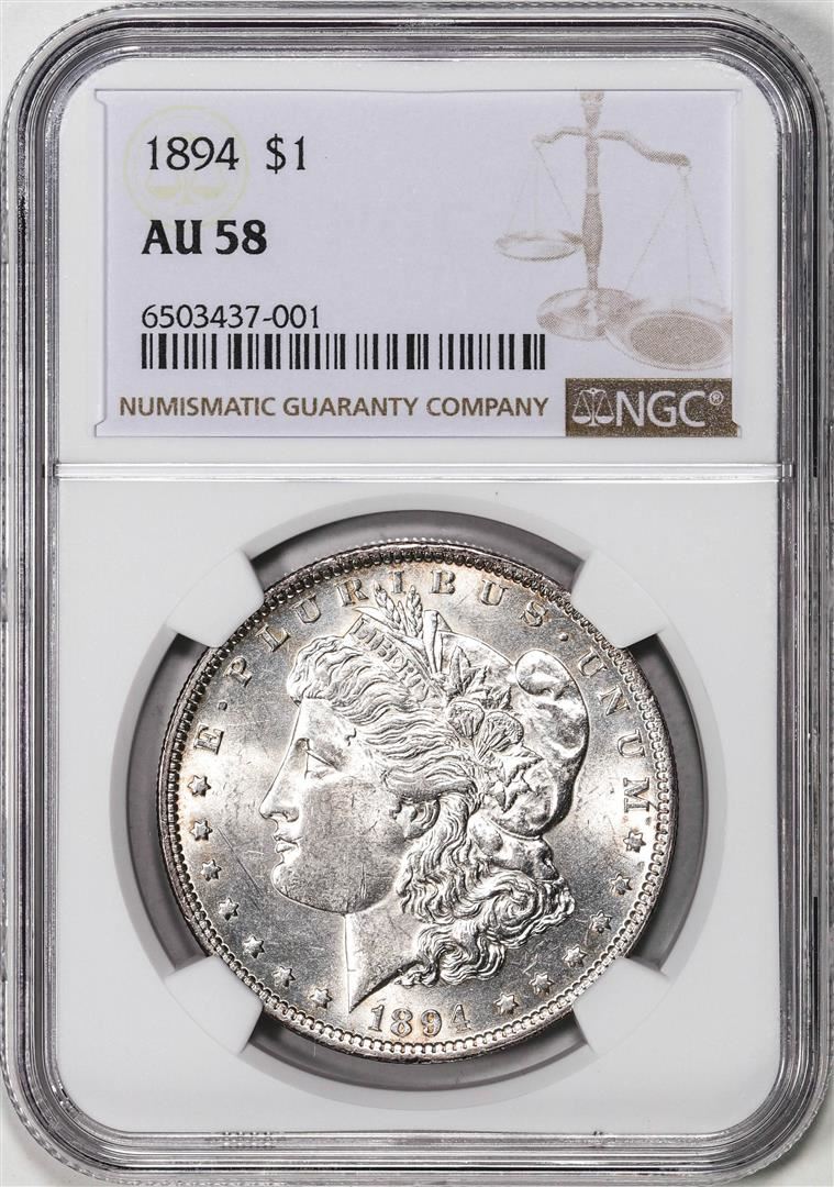One 1894 $1 Morgan Silver Dollar Coin NGC AU58. NGC Certified.