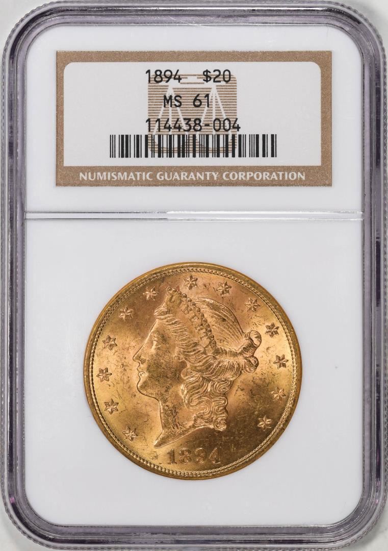One 1894 $20 Liberty Head Eagle Gold Coin NGC MS61. NGC Certified.