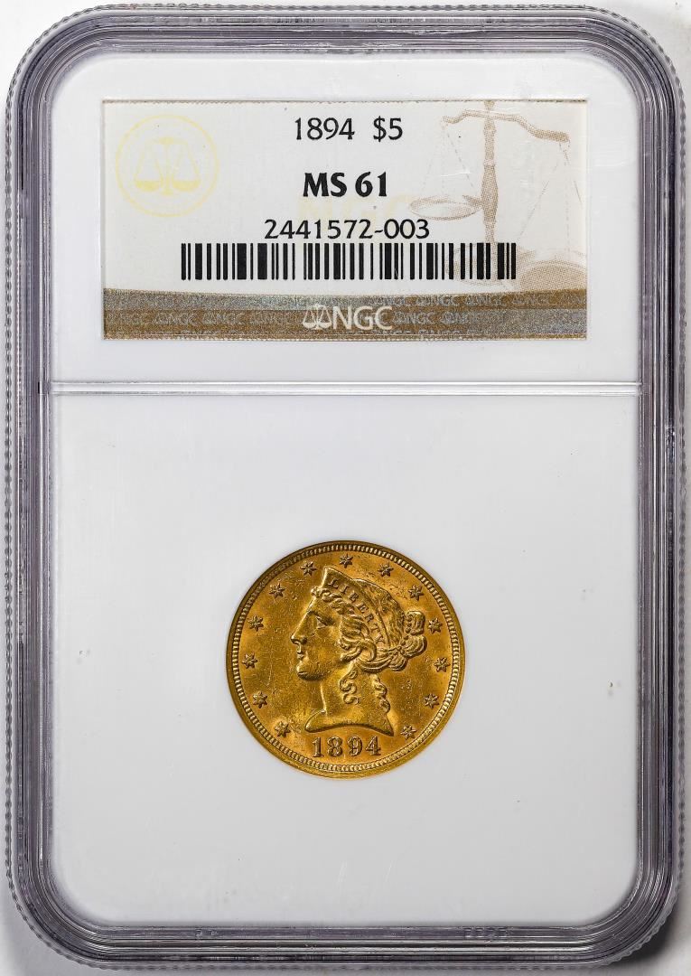 One 1894 $5 Liberty Head Half Eagle Gold Coin NGC MS61. NGC Certified.