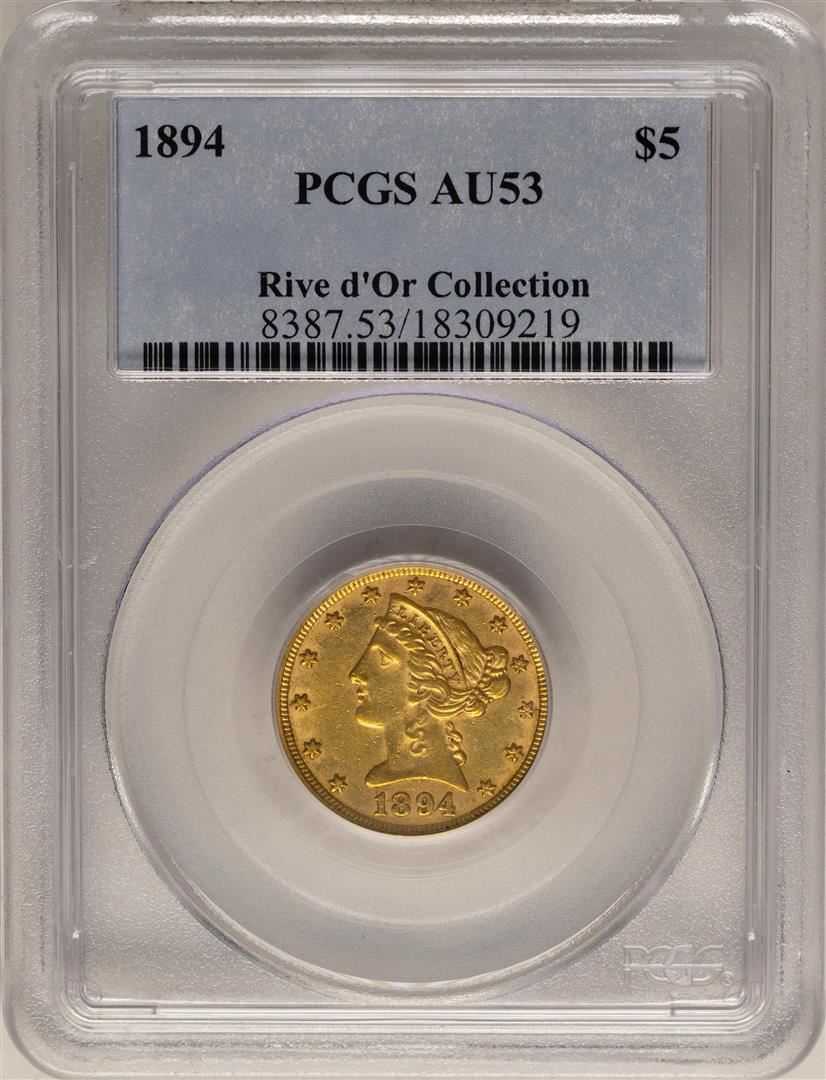 One 1894 $5 Liberty Head Half Eagle Gold Coin PCGS AU53. PCGS Graded.