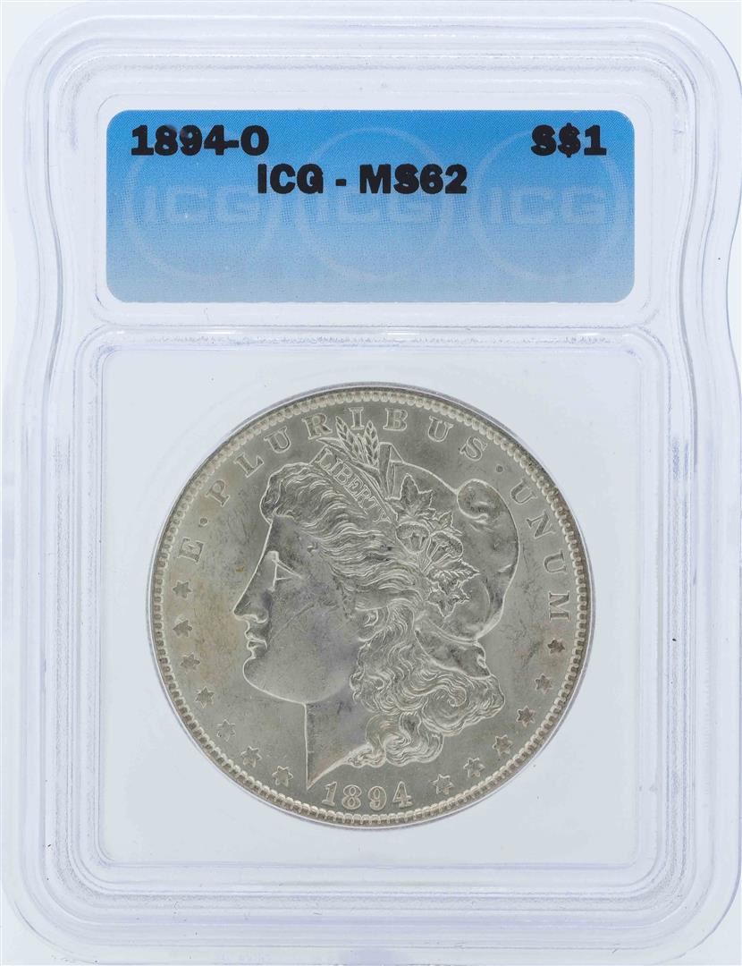 One 1894-O $1 Morgan Silver Dollar Coin ICG MS62. ICG Certified.