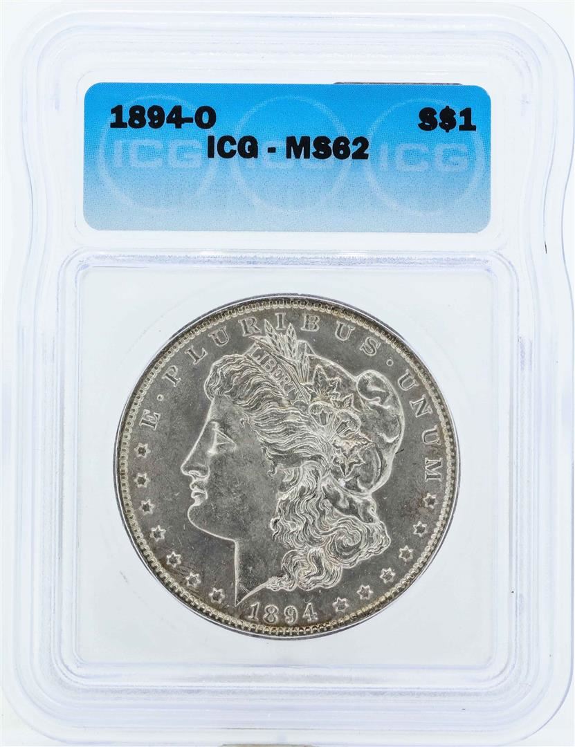 One 1894-O $1 Morgan Silver Dollar Coin ICG MS62. ICG Certified.