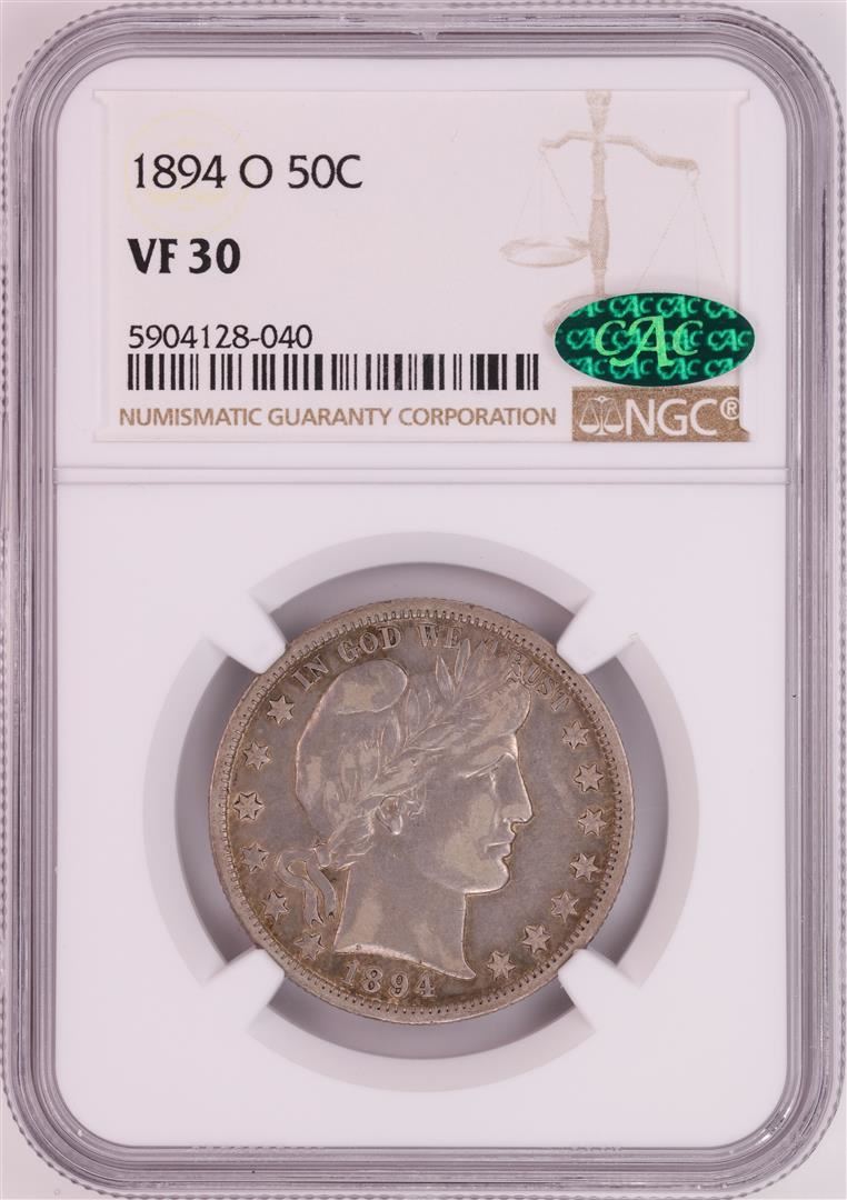 One 1894-O Barber Half Dollar Coin NGC VF30 CAC. NGC Certified.